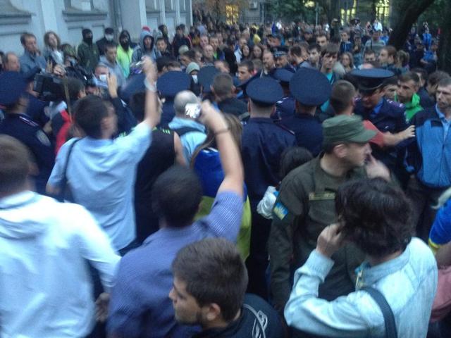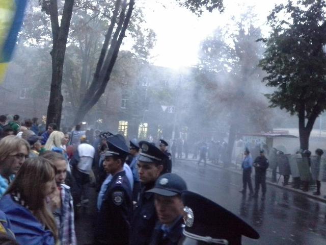 Позже обстановка у консульства накалилась. Присутствующие на акции футбольные ультрас стали бросать петарды и дымовые шашки в сторону здания консульства России. Часть участников акции просили этого не делать. Сотрудники милиции попытались задержать одного из тех, кто бросал пиротехнику. Между ними и ультрас произошла драка, во время которой один из митингующих применил слезоточивый газ. Позже сотрудники милиции задержали одного из ультрас и увезли его на милицейском автомобиле. Группа футбольных фанатов попыталась догнать и заблокировать автомобиль, однако им это не удалось. Позже стало известно, что задержанного отпустили спустя час после задержания.
