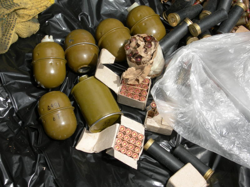 В гараже находились ящики, мешки и ведра, наполненные патронами к различным видам оружия, более 250 гранат и 6 ручных противотанковых гранат, три пистолета, револьвер, винтовка, тротиловые шашки и другие боеприпасы.