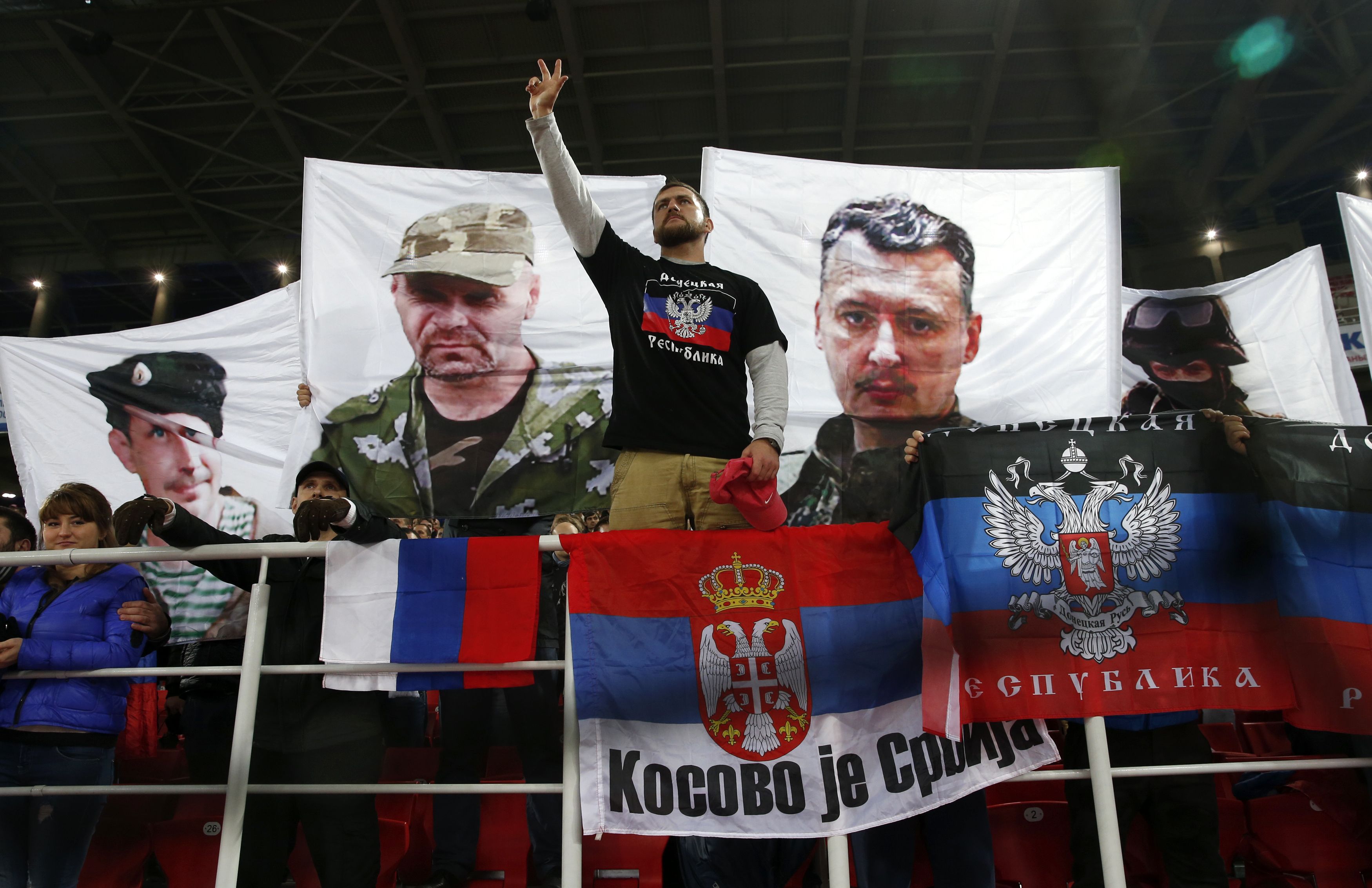 А рядом с флагом "ДНР" российские фанаты вывесили флаг с надписью "Косово это Сербия".