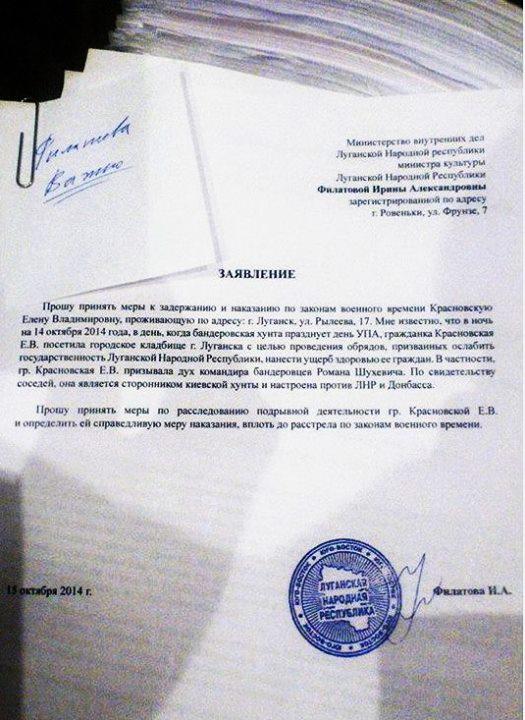 Луганский правозащитник Николай Козырев обнародовал на своей странице в Facebook фотокопию документа, из которого следует, что "министр культуры" ЛНР Ирина Филатова требует от "министра внутренних дел" расстрелять местную жительницу Елену Красновскую за то, что якобы последняя 14 октября "на кладбище проводила обряды, направленные на ослабление государственности ЛНР" и "вызвала дух Романа Шухевича".