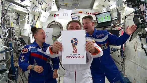 Сначала эмблему показали космонавты на листе бумаги. После этого эмблему ЧМ-2018 представили вип-гости шоу "Вечерний Ургант".