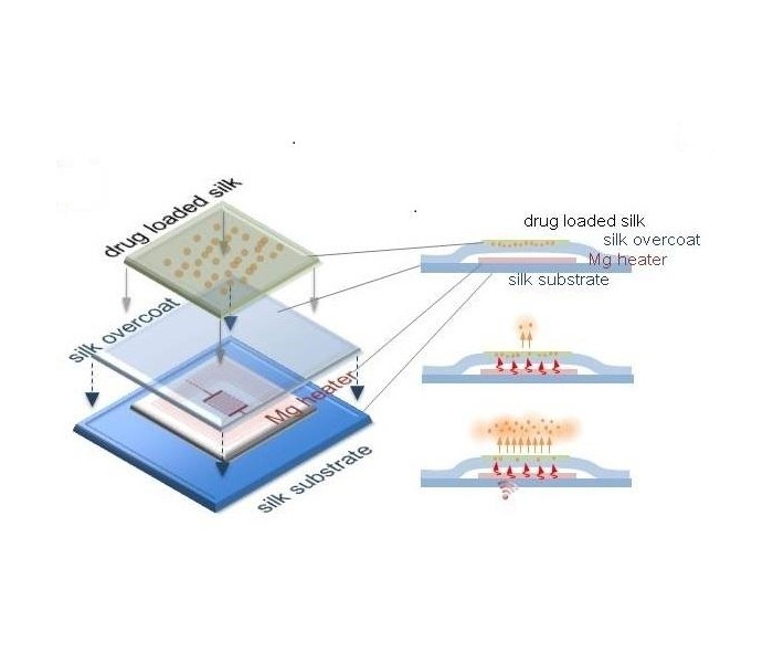 Сам имплантат состоит из резистора змеевидной формы, энергопринимающей катушки из магния и специального слоя из протеина шелка, содержащего лекарственное средство. Работает все следующим образом: имплантат удаленно получает радиосигнал, электронные компоненты нагревают магниевую составляющую, которая в свою очередь разрушает структуру шелковой подложки, высвобождая частицы лекарственного средства.