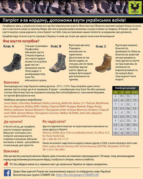 Поэтому мы хотим запустить инициативу - сбор военной обуви для украинских бойцов АТО. Все желающие могут купить пару берцев и прислать в Украину.
