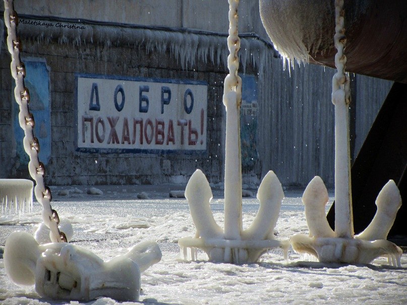 Из-за высокой влажности воздуха и морозов - все покрылось льдом - пирсы, фонтаны, скамейки и пляжные раздевалки.