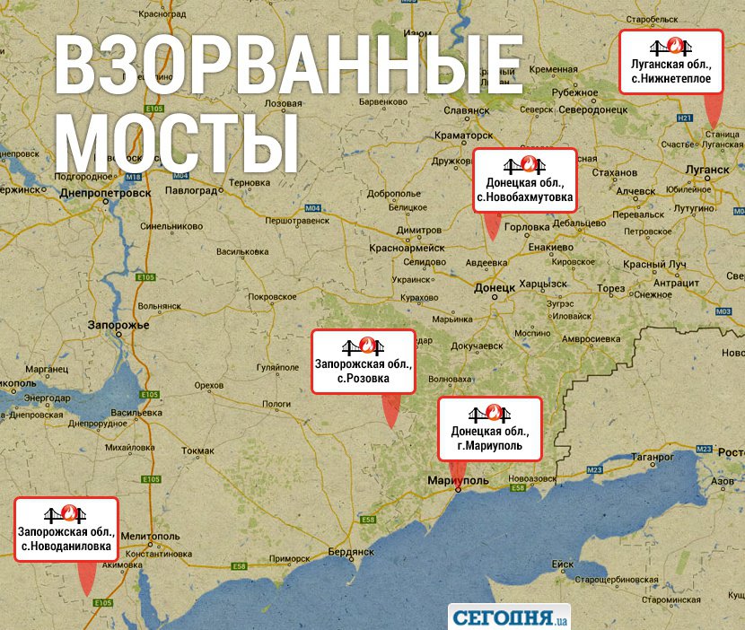20 января неподалеку поселка Розовка в Запорожской области был взорван мост. "Произошедшее квалифицируется, как подрыв – по статье 258 Уголовного кодекса Украины – (террористический акт)", – отметил прокурор Запорожской области Александр Шацкий и уточнил, что в результате взрыва, приведшего к повреждению мостовых конструкций и железнодорожного полотна, с рельс сошли 13 вагонов железнодорожного состава. До восстановления путипровода пассажирский поезд "Сартана – Киев" переименован в "Бердянск – Киев".