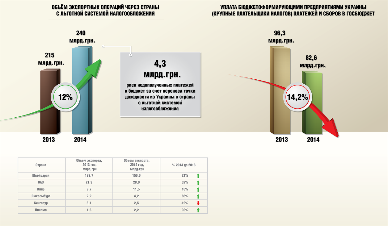 Бывший министр обращает внимание на тот факт, что крупные налогоплательщики по итогам 2014 года снизили уплату основных налогов на 13,7 млрд грн, но вместе с тем увеличили экспорт в страны со льготным налогообложением на 25 млрд грн, или на 12% по сравнению с прошлым годом.