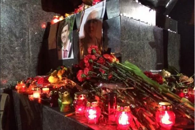 К памятнику Шевченко люди пришли с фотографиями погибших и свечами. Прощание началось с гимна Украины.