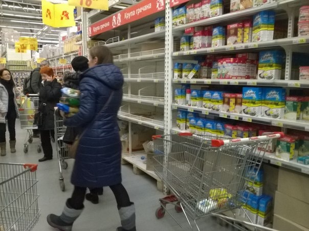 Двумя днями раньше крупы, мука, подсолнечное масло и сахар исчезли с полок магазинов. Через день продукты снова появились, но уже по новым ценам. В первый день ажиотажа киллограм сахара на центральном рынке продавали уже по 28 гривен, а в киосках — все еще по 18. При этом в супермаркетах фасованный сахар стоил 15 гривен. В тех супермаркетах, где цены еще не поднялись, выстроились огромные очереди.