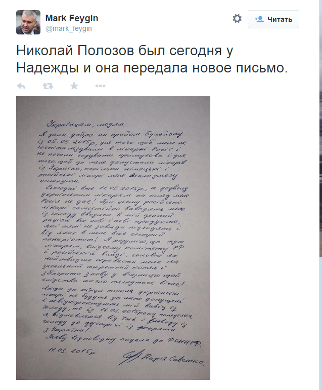 Этим днем Савченко сообщила, что готова вернуться к голодовке, если к ней не допустят врачей из Украины. По ее словам, в тюрьме ее выводят из голодания такими продуктами, которые вызвали у нее острый панкреатит.