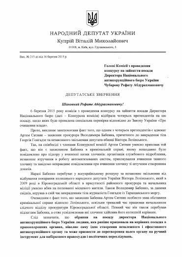 Народный депутат направил председателю конкурсной комиссии обращение с изложенными фактами: