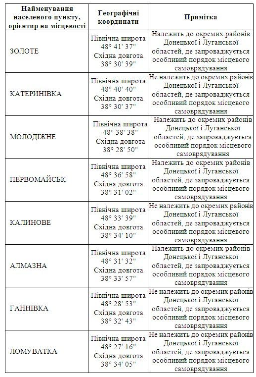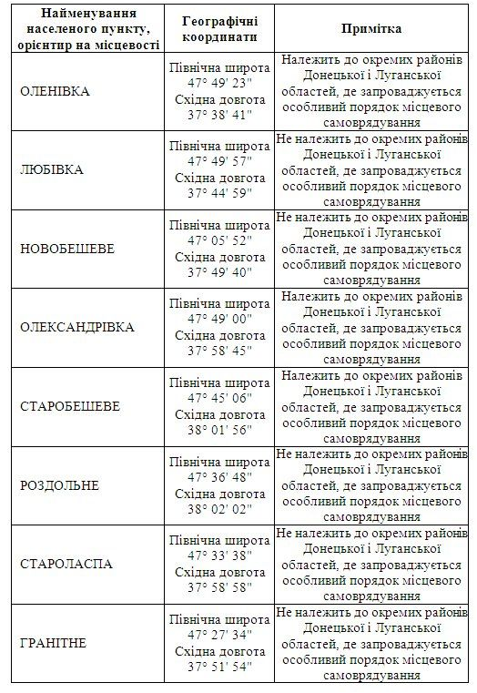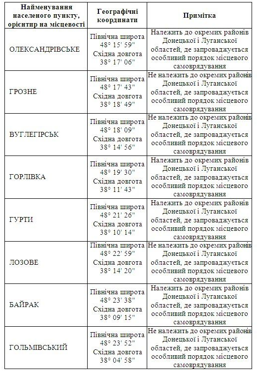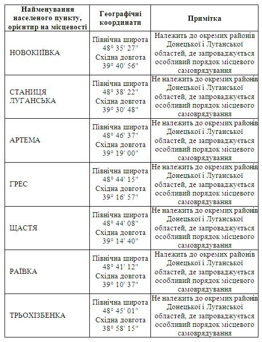 Не относятся к отдельным районам Донецкой и Луганской областей, где вводится особый порядок местного самоуправления: Станица Луганская, Артёма, Грэс, Счастье, Трехизбенка, Смелое, перекресток дорог, Новотошковское, Нижнянский разъезд, Ореховое, Золотое, Катериновка, Калиновое, Ганновка, Ломоватка, Вергулевка, отм. 298,0, Шахта № 2, Никишино, Разъезд Кумшацкий, Ост. платформа 20 км, Орлово-Ивановка, Новоорловка, Малоорловка, Славное, Грозное, Углегорск, Лозовое, Гольмовский, Зайцево, жд ст. Майорская, Кирово, Дзержинск, Ленинское, Новгородское, Широкая Балка, Озеряновка, Михайловка, Верхнеторецкое, Авдеевка, Опытное, Веселое, Пески, отм. 221,1, Красногоровка, Марьинка, Славное, Любовка, Новобешево, Раздольное, Староласпа, Гранитное, Чермалык, Павлополь, Талаковка, Широкино.