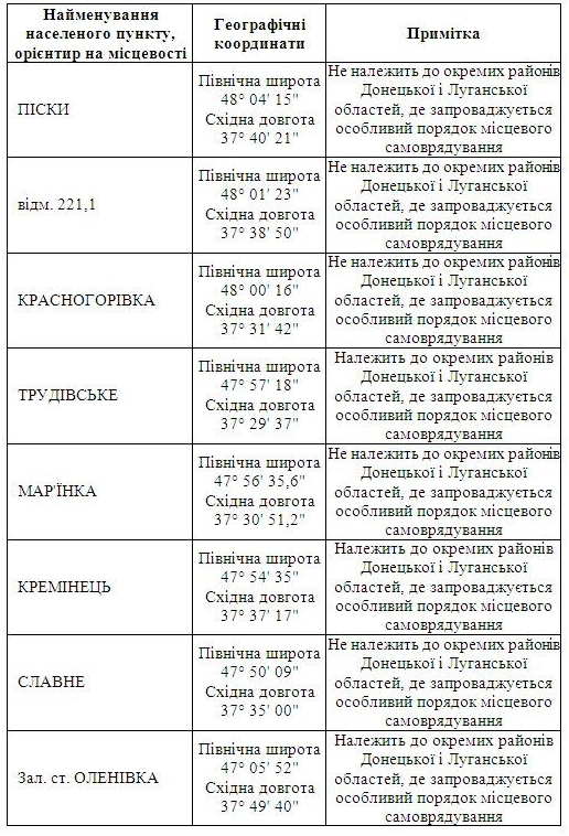 Всего в перечень попало 85 районов или их частей, городов, поселков и сел, расположенных между границей с Россией, Азовским морем и линией разграничений от 19 сентября 2014 года. Также в приложении, кроме населенных пунктов, указаны железнодорожные станции, Шахта № 2 и территории, которые не подпадают под особый статус.