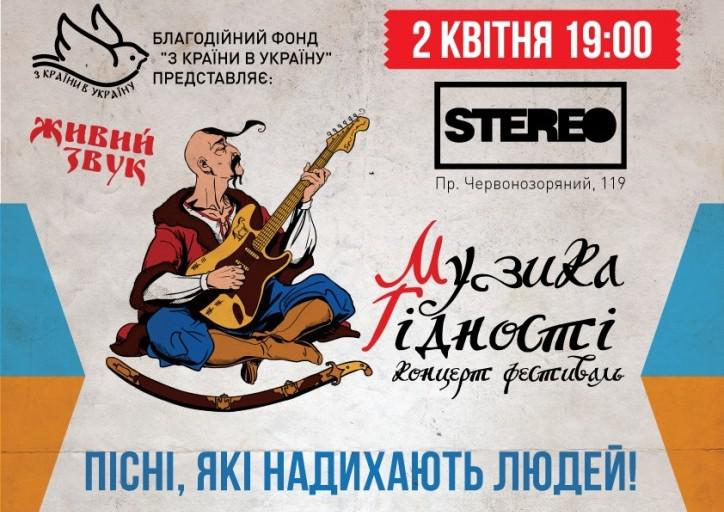 Шестнадцать лучших украинских групп, среди которых: ЯрмаК, Nesprosta, Крошка, Dakh Daughters, Сергей Кузин, Mad Heads, Нумер 482, Катя Chilly, Тоня Матвиенко, OT VINTA, Один в каноэ, Vivienne Mort, Арсен Мирзоян, Путешествия, Телери, Zapaska и ряд других коллективов специально к проекту «Музыка достоинства» готовят кавер-версии украинских героических песен времен повстанческих движений, которые будут записаны на концерте и переданы во все воинские части Украины.
