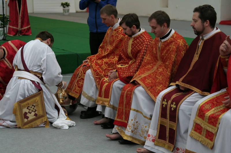 В этот день в храме служат Литургию св. Василия Великого, а епископы умывают ноги 12 священнослужителям, как это сделал Иисус Христос две тысячи лет назад своим ученикам в знак глубокого смирения и любви к ним, а также как назидание всем христианам не находить власти друг над другом, а служить друг другу. Вспоминается молитва Господа в Гефсиманском саду, когда Христос от душевных страданий плакал кровавыми слезами.
