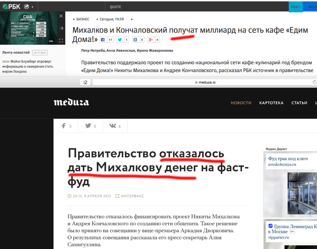 Пользователей сети смутило, что издания РБК и Meduza почти одновременно вышли с материалами, чьи заголовки противоречат друг другу.