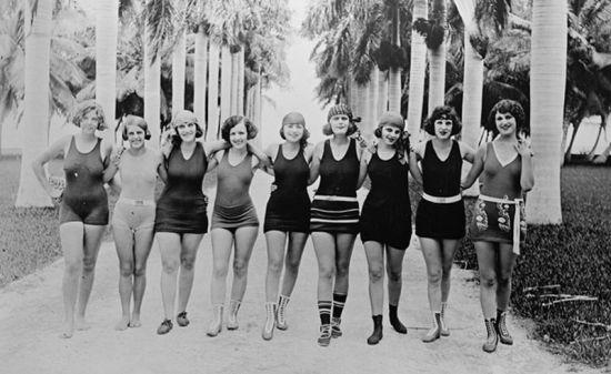 Купальники, которые должны были прикрывать ягодицы, в основном делали из шерсти. Неизменный атрибут пляжниц тех лет — зонтик. Также можно было увидеть дам в коротких чулках и обуви.