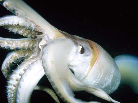 Косвенно это утверждение подтверждается благодаря полученным кадрам – у заснятой особи отсутствует пара самых длинных щупалец, которые кальмар, возможно, потерял в схватке с врагом.