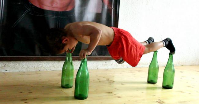 Пятилетний мальчик легко отжимается на 4 бутылках (ВИДЕО)