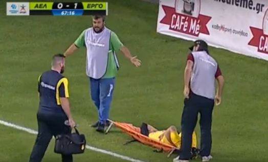 Полузащитник "Эрготелиса" Леонардо Коутрис получил травму и не смог подняться с поля. Вероятно, футболисты "Лариса" и сотрудники стадиона предположили, что футболист нарочно затягивает время и симулирует.