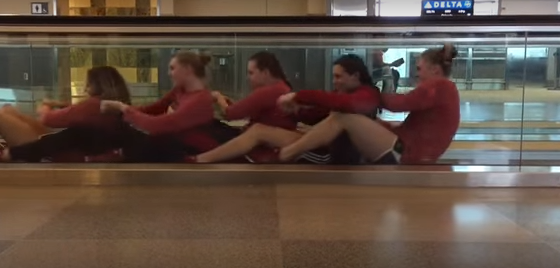 Видеоролик был сделан в международном аэропорту Северной Каролины. Его опубликовала на своей странице в Фейсбуке одна из участниц команды по имени Келси Уоррелл."Те, кто считают пловцов странными, возможно, правы", — написала девушка в посте с видео.