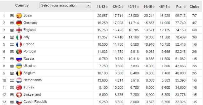 УЕФА обнародовала обновленную таблицу коэффициентов