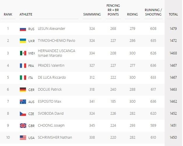 Первое место с результатом 1479 очков занял российский пятиборец Александр Лесун. Бронза досталась мексиканцу Марсело Эрнандесу с результатом 1468 очков.