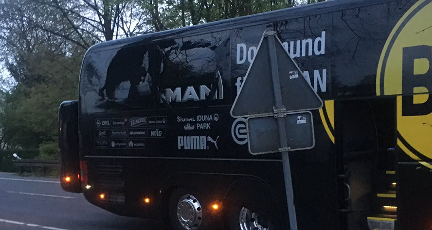 Позже в Сети появились фото автобуса дортмундской «Боруссии» после взрыва. На снимках можно увидеть разбитые окна в задней части автобуса.
