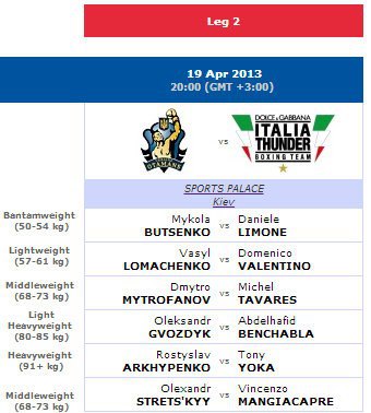Как вы можете видеть, против Ломаченко, Митрофанова и Гвоздика тренерский штаб итальянцев решил выставить многоопытных бойцов WSB. В то же время, соперниками Буценко и Архипенко станут не такие грозные боксеры. Правда, Буценко уже встречался с Лимоне и безоговорочно выиграл тот бой.