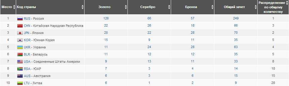 Копилка "сине-желтых" пополнилась достаточным количеством наград, чтоб уверенно удерживать пятое место. Как и вчера, у нас 11 золотых. Серебро и бронза увеличились на четыре штуки - 24 и 28 соответственно.