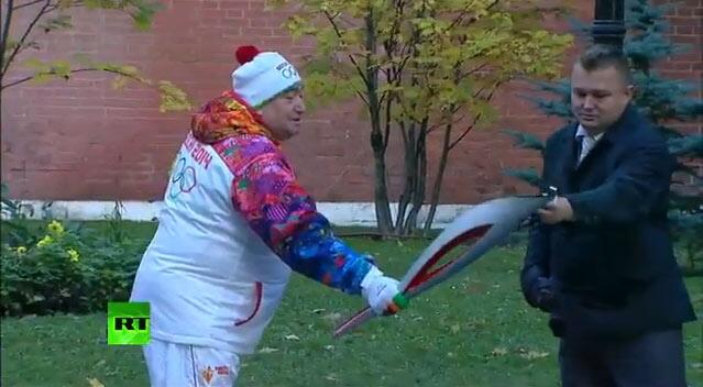 Один из участников эстафеты некоторое время бежал с потухшим факелом. Секьюрити помог ему вновь зажечь огонь.