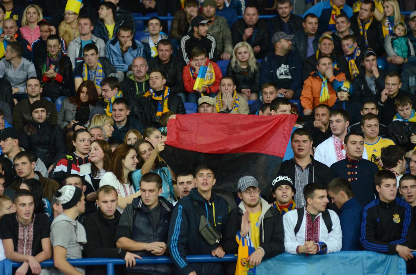 Надо отметить, что украинские болельщики в этот раз вели себя на стадионе вполне прилично. Видимо санкции ФИФА чему-то да научили. Даже файеры не жгли, а нацистской символики на трибунах зафиксировано не было, если, конечно, не считать красно-черный флаг, но на счет него мнение украинцев разделилось.