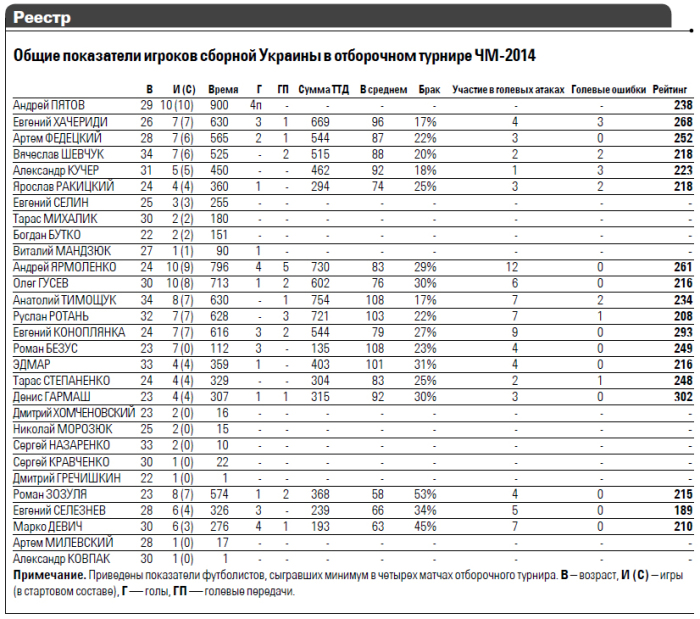 Перед важным матчем со сборной Франции анализируем рейтинг игроков национальной сборной. Совсем уж объективным данный анализ считать трудно по одной простой причине: некоторым футболистам повезло сыграть против Сан-Марино, а другие выполняли все свои полезные ТТД в сложнейших поединках с лидерами группы. Тем не менее, нужно отметить, что самым активным игроком национальной команды по среднему количеству действий стал неувядаемый Анатолий Тимощук. К манере его игры можно относиться по разному, но, похоже, Михаилу Фоменко удалось найти подход к этому исполнителю.