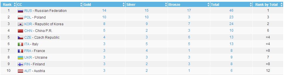 За день до конца сборная Украины занимает восьмую строчку в общекомандном рейтинге. Медалей всех отличий у нас по три. Тройка неизменна - Россия, Польша, Корея. К слову, за эти дни 31 страна приняла участие в церемонии награждения.