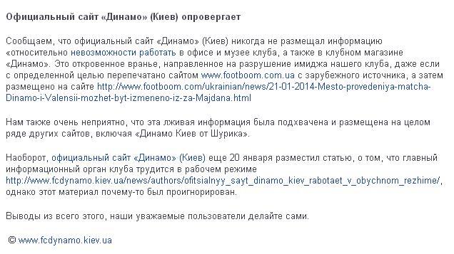 Официальный сайт также отмечает, что «эта лживая информация была подхвачена и размещена на целом ряде других сайтов». При этом подчеркивается, что еще 20 января на fcdynamo.kiev.ua была размещена статья, о том, что «главный информационный орган клуба трудится в рабочем режиме».