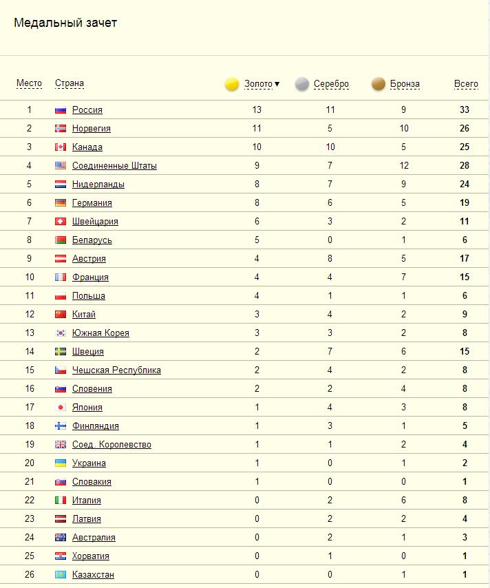 В командной борьбе между странами сильнейшей оказалась хозяйка Игр. Россия выиграла общекомандный рейтинг и побила свое историческое достижение. Теперь в Пхенчхане сборной РФ придется ориентироваться на новый рекорд - 13 золотых, 11 серебряных и 9 бронзовых медалей. Также России удалось собрать наибольшее количество медалей - 33. Больше ни одна из держав не перешагнула рубеж 30-ти олимпийских отличий.