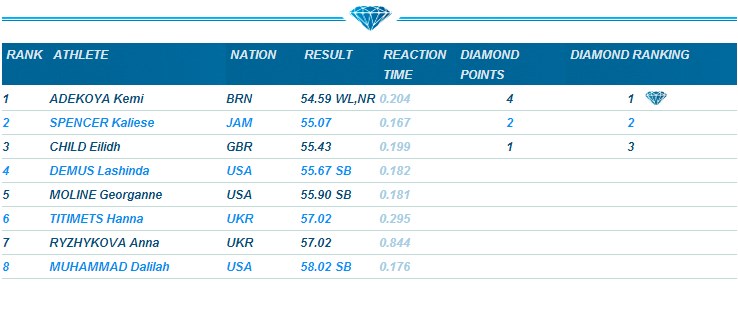 Келис Спенсер из Ямайки финишировала следом за Адекойя, что было достаточно неожиданно. Результат Спенсер - 55.07 с.