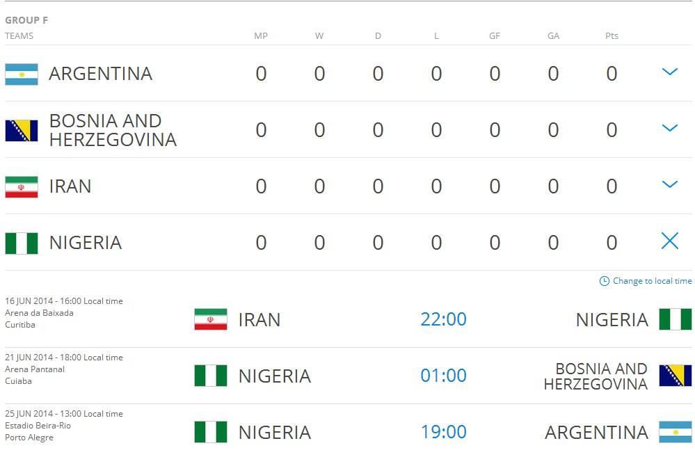 В Бразилию без Идейе. Визитка сборной Нигерии. ЧМ-2014Помимо Аргентины в группе F Нигерия будет бороться с Боснией и Герцеговиной и Ираном. Матч с "мелли" откроет мундиаль для "суперорлов" 16 июня на "Арене Байшада" (в 22:00 по Киеву). Встреча с "сине-желтые" состоится 22 июня на "Арене Пантанал" (в 01:00 по Киеву). Знакомые соперники станут последними на групповом этапе - 25 июня, "Бейра-Рио" (в 19:00 по Киеву).