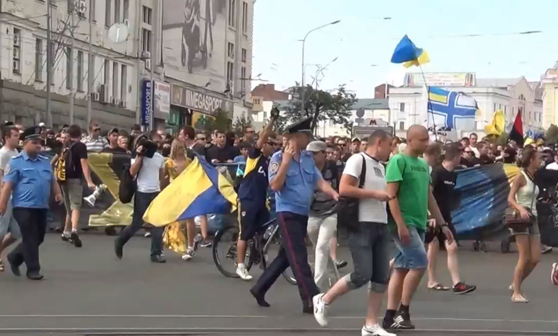 Перед началом матча второго тура Премьер-лиги между харьковским "Металлистом" и киевским "Динамо" прошло шествие футбольных болельщиков обеих команд.