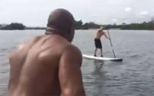 На видео можно наблюдать, как во время тренировки украинского боксера на воде, когда Кличко плыл на доске, Бриггс появился на катере со своим помощником и, создав вокруг Кличко сильные волны, опрокинул его с доски в воду.