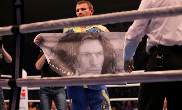 Зрители в киевском Дворце спорта вместе со спортсменом почтили память певца, встав со своих мест.