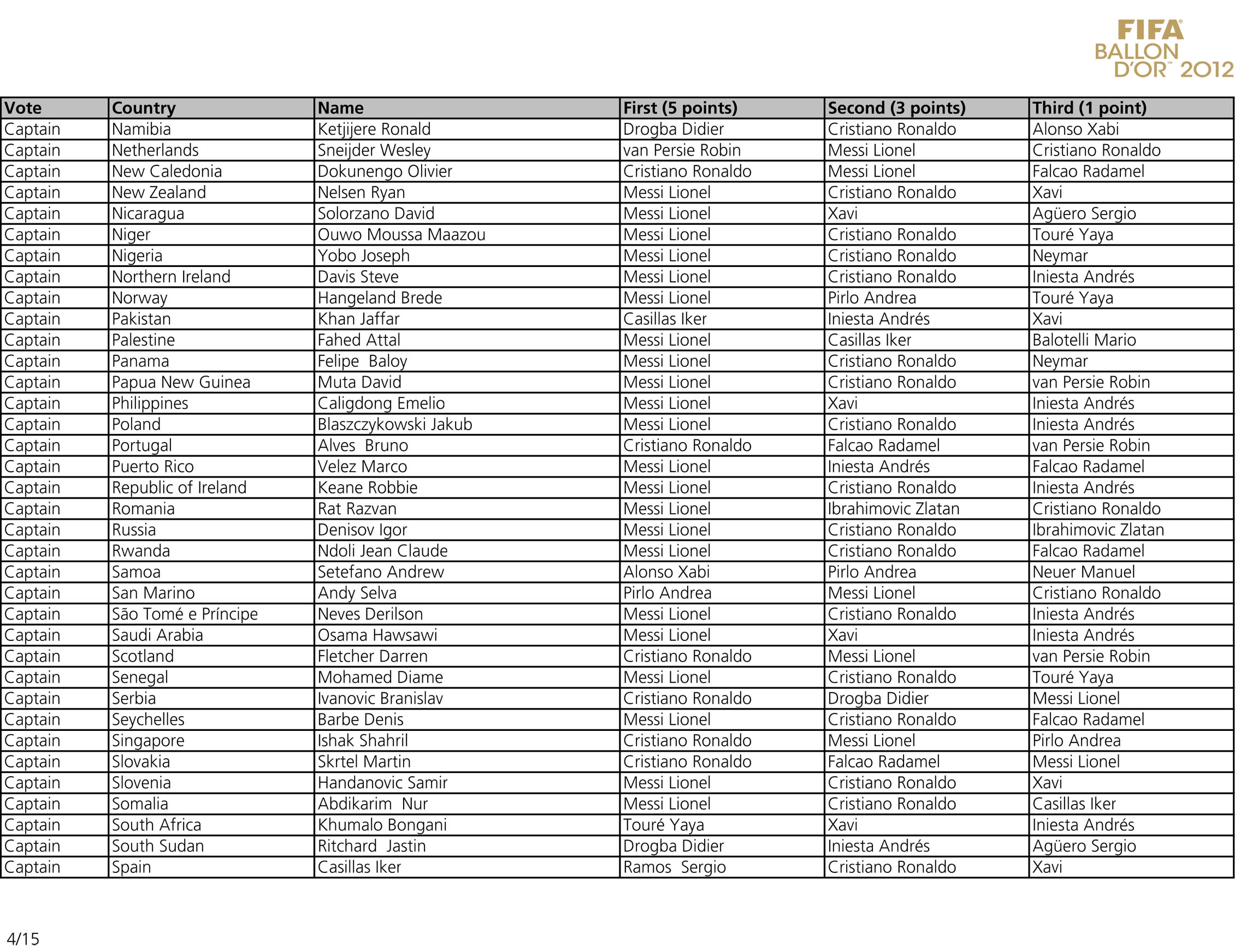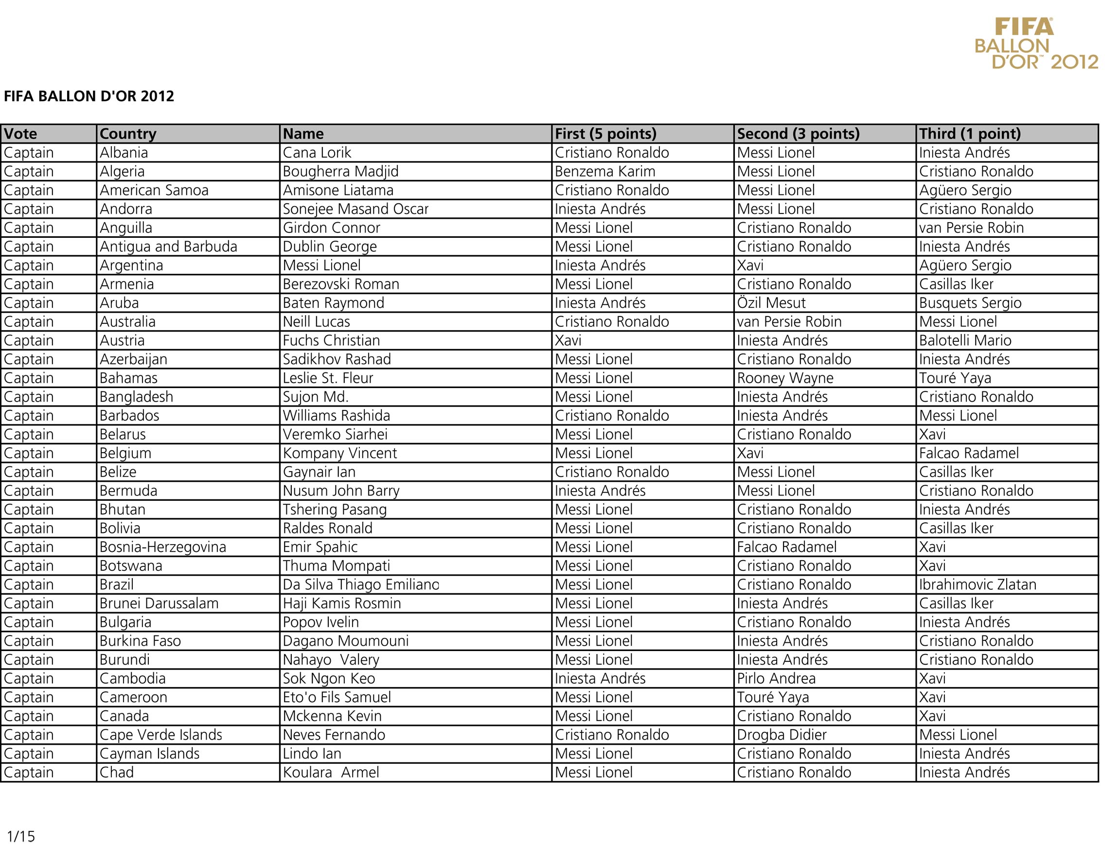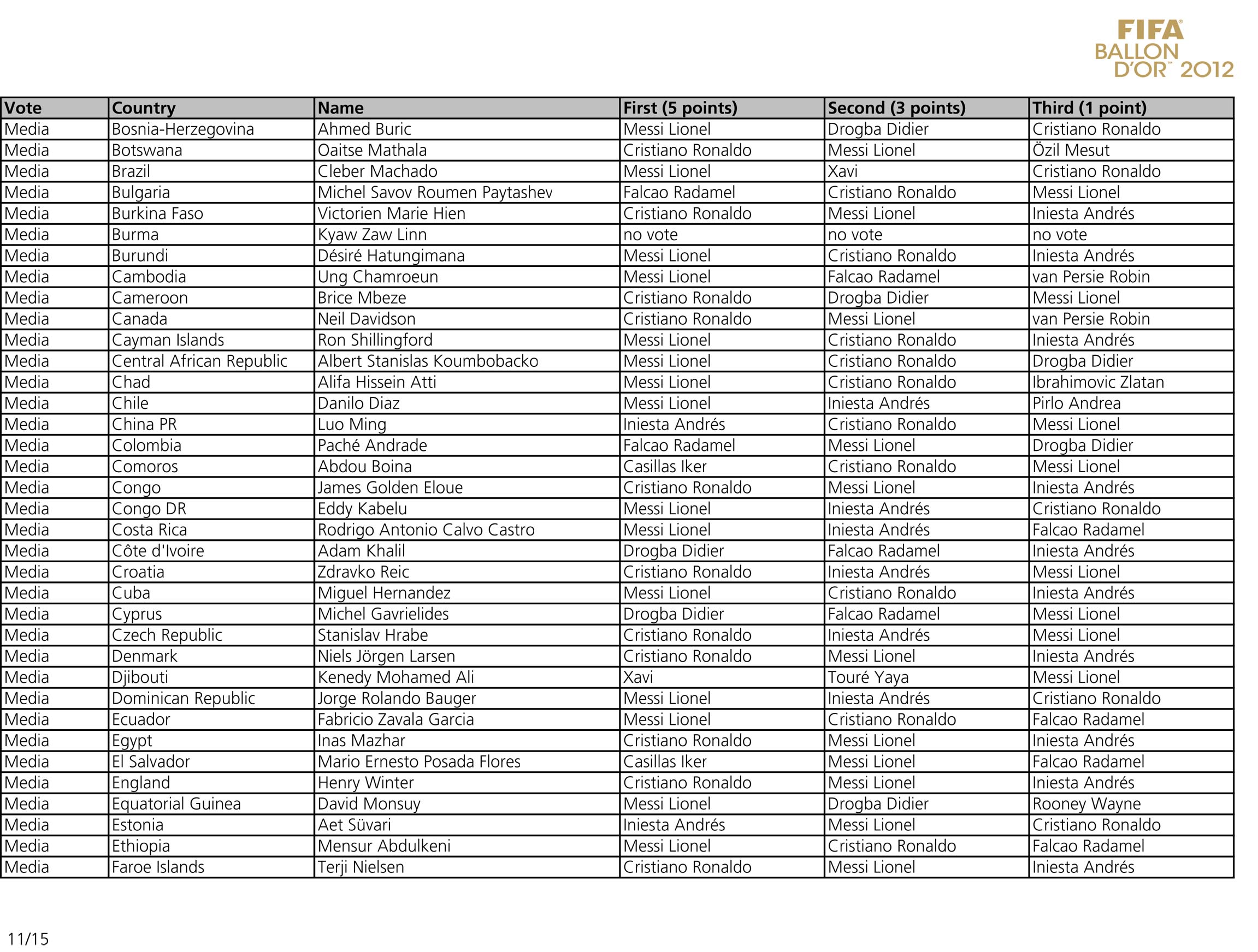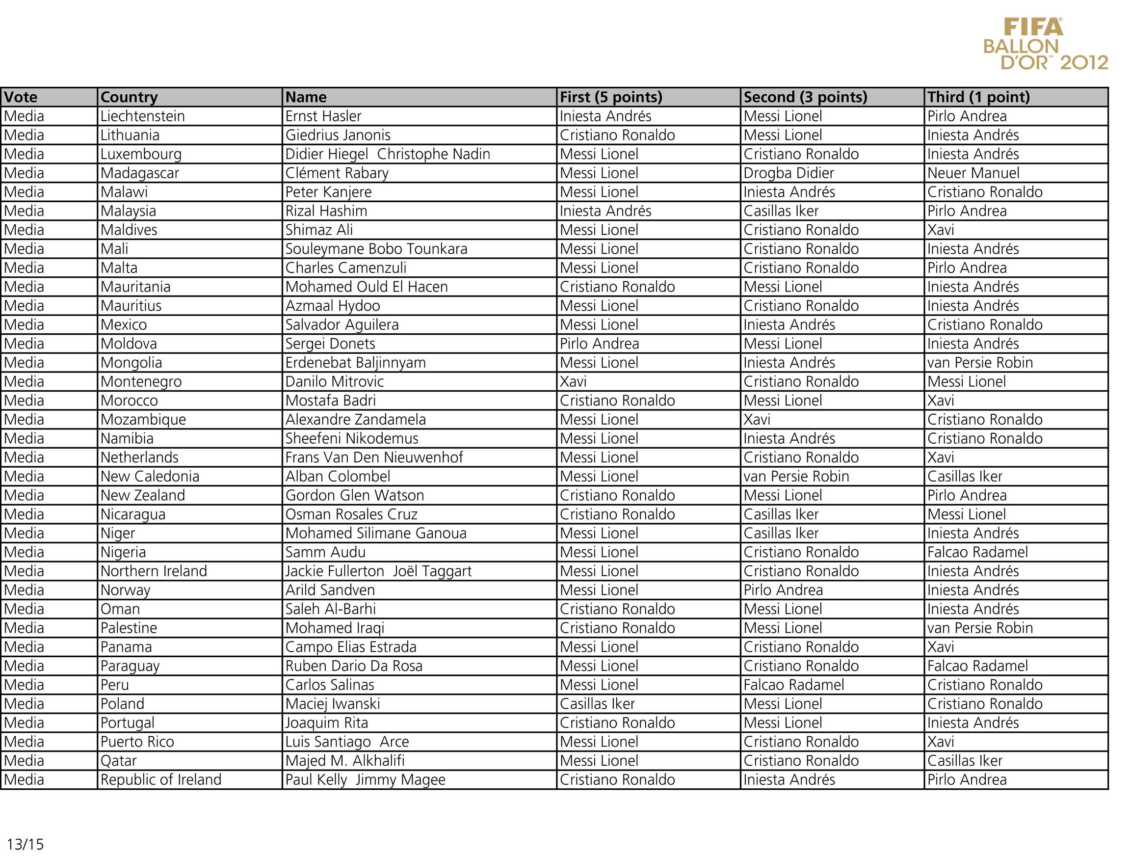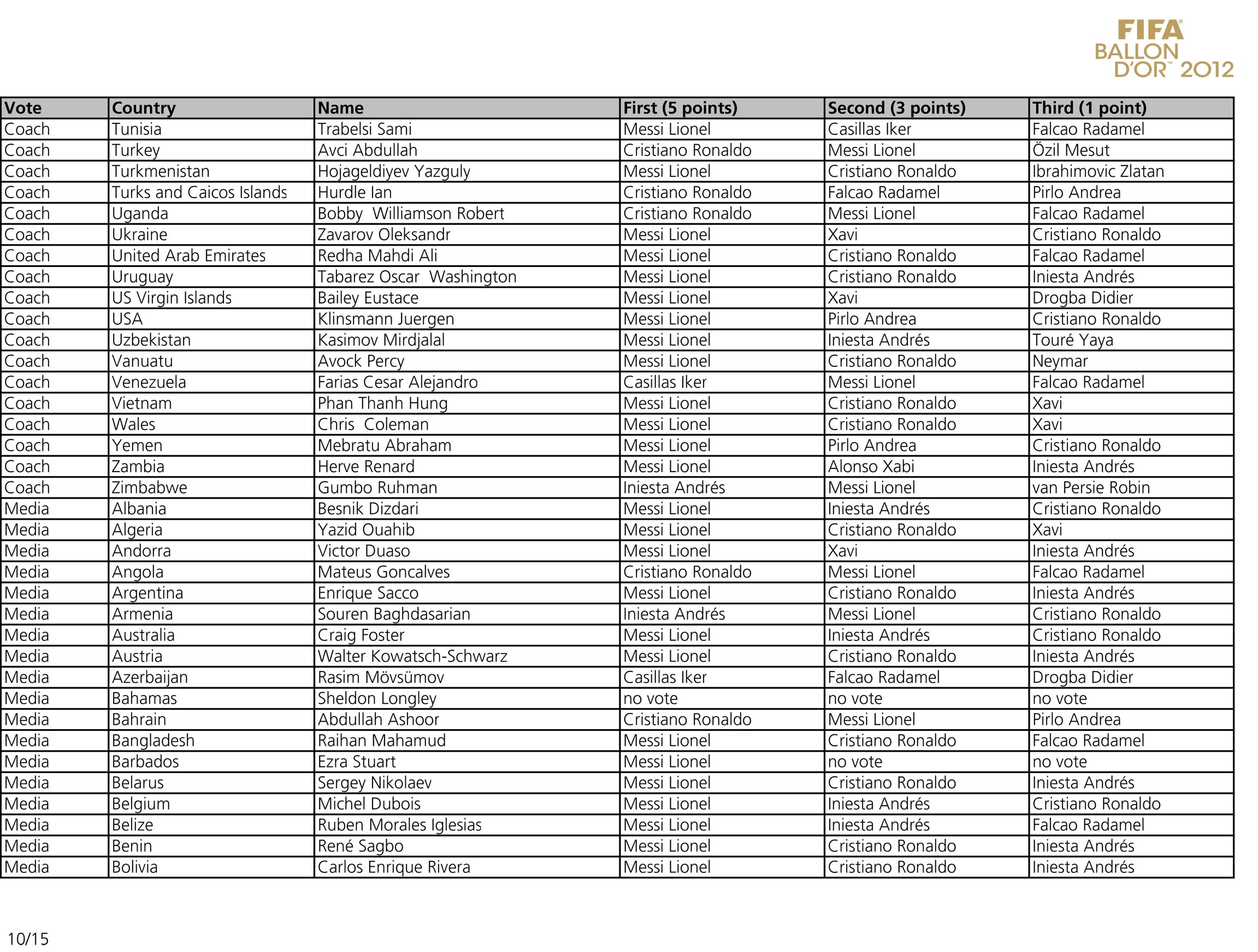 Результаты голосования за титул обладателя "Золотого Мяча - 2012" (ФОТО)