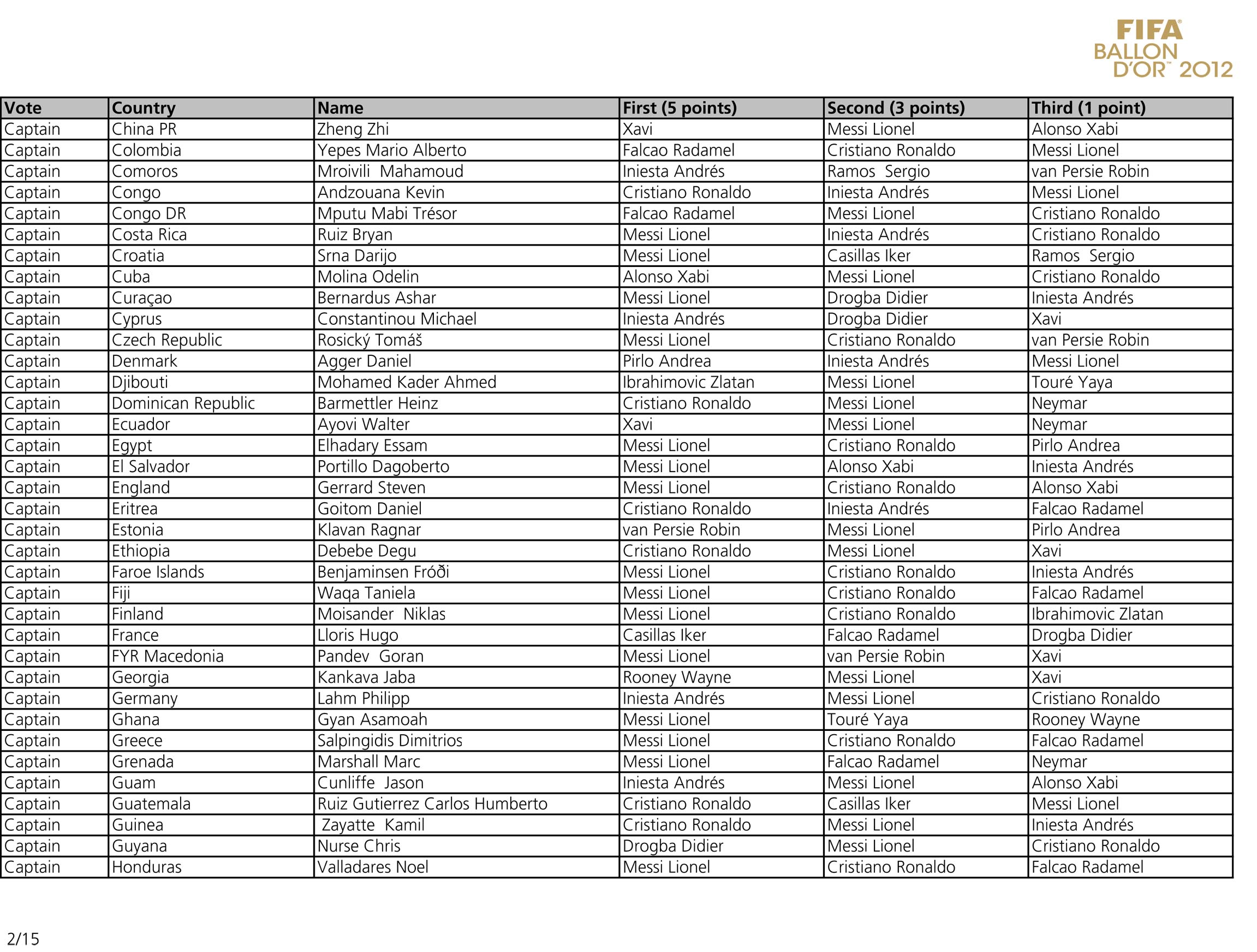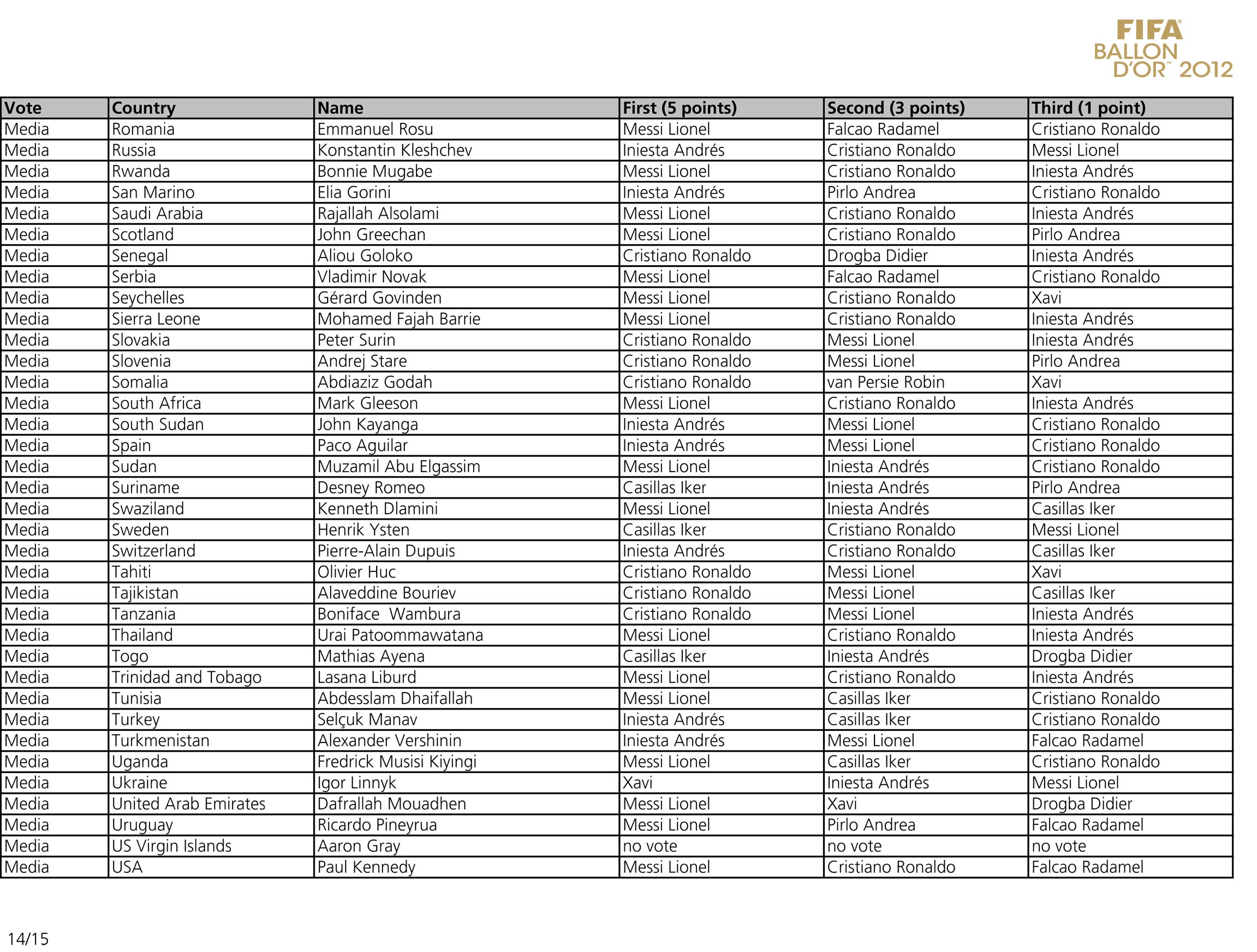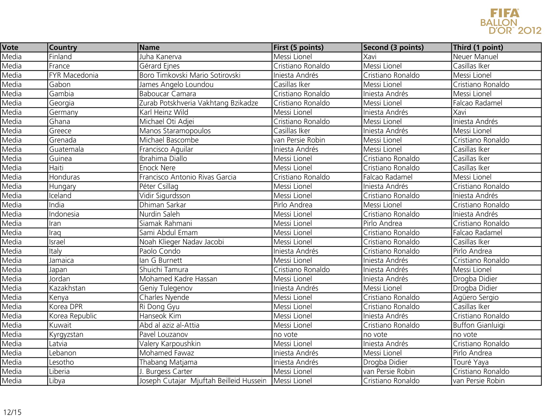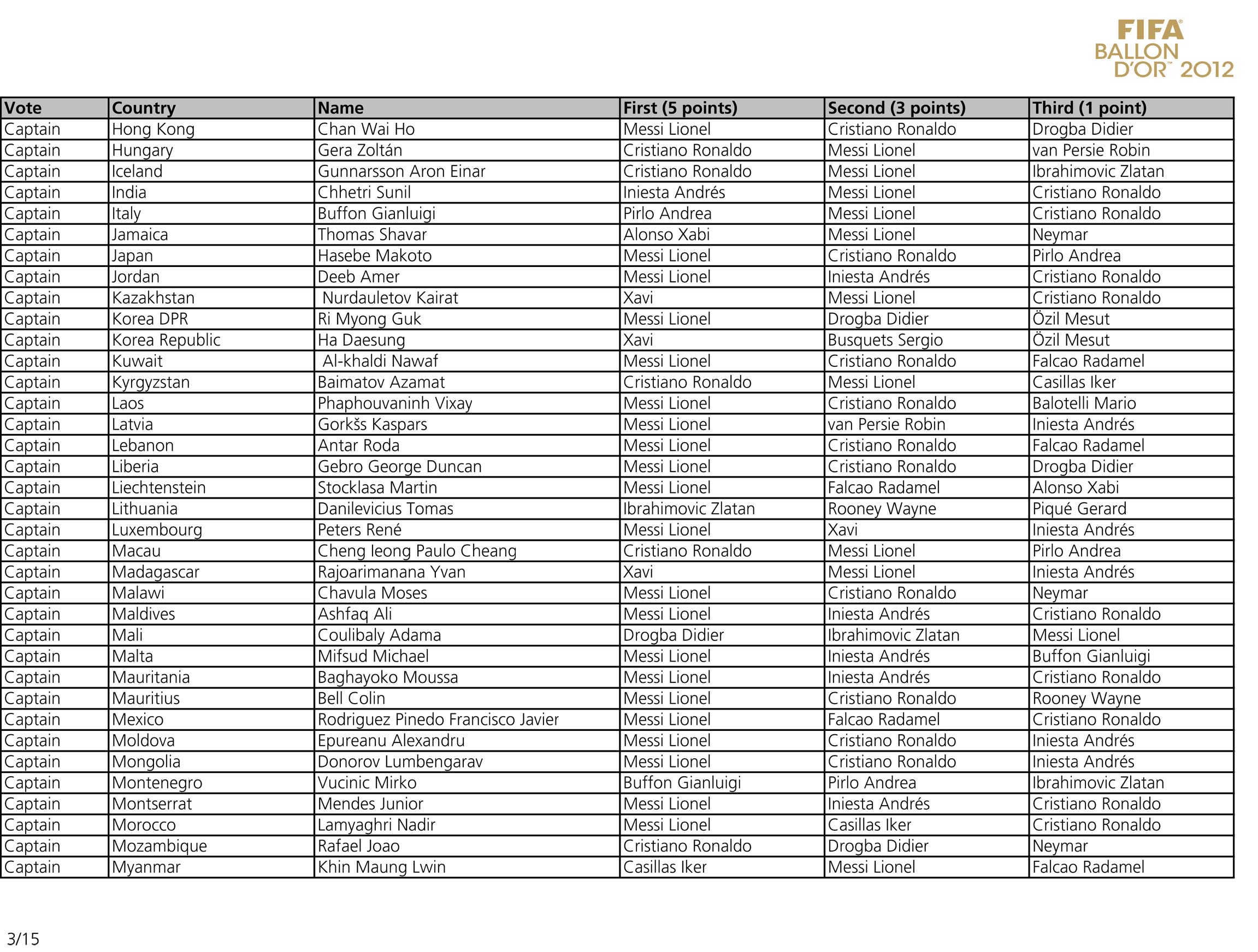 Результаты голосования за титул обладателя "Золотого Мяча - 2012" (ФОТО)