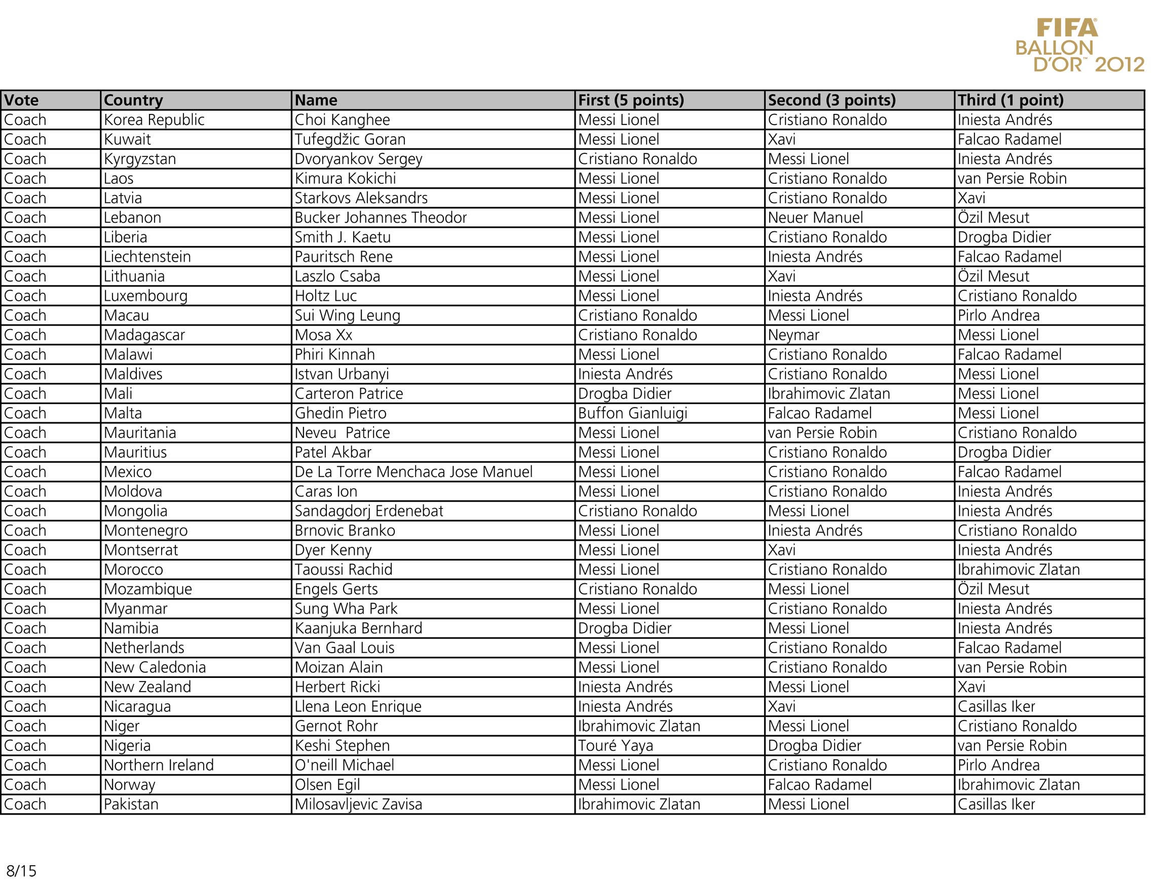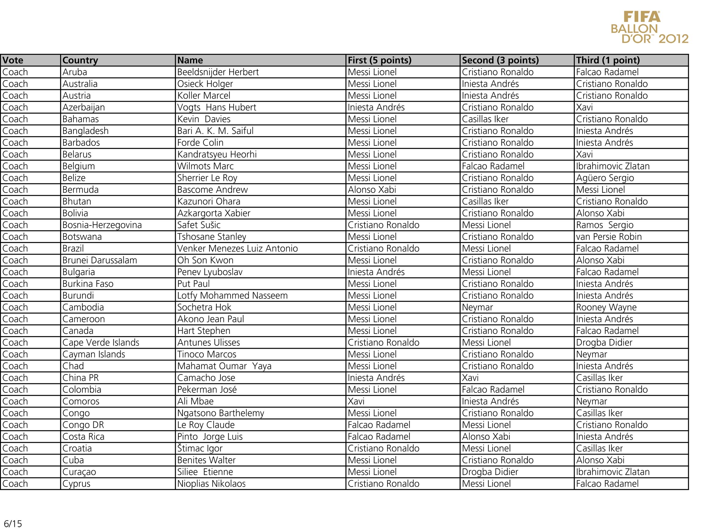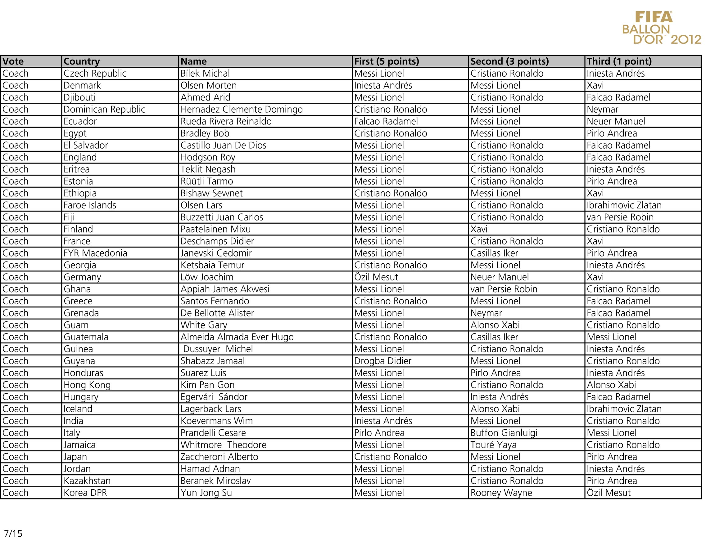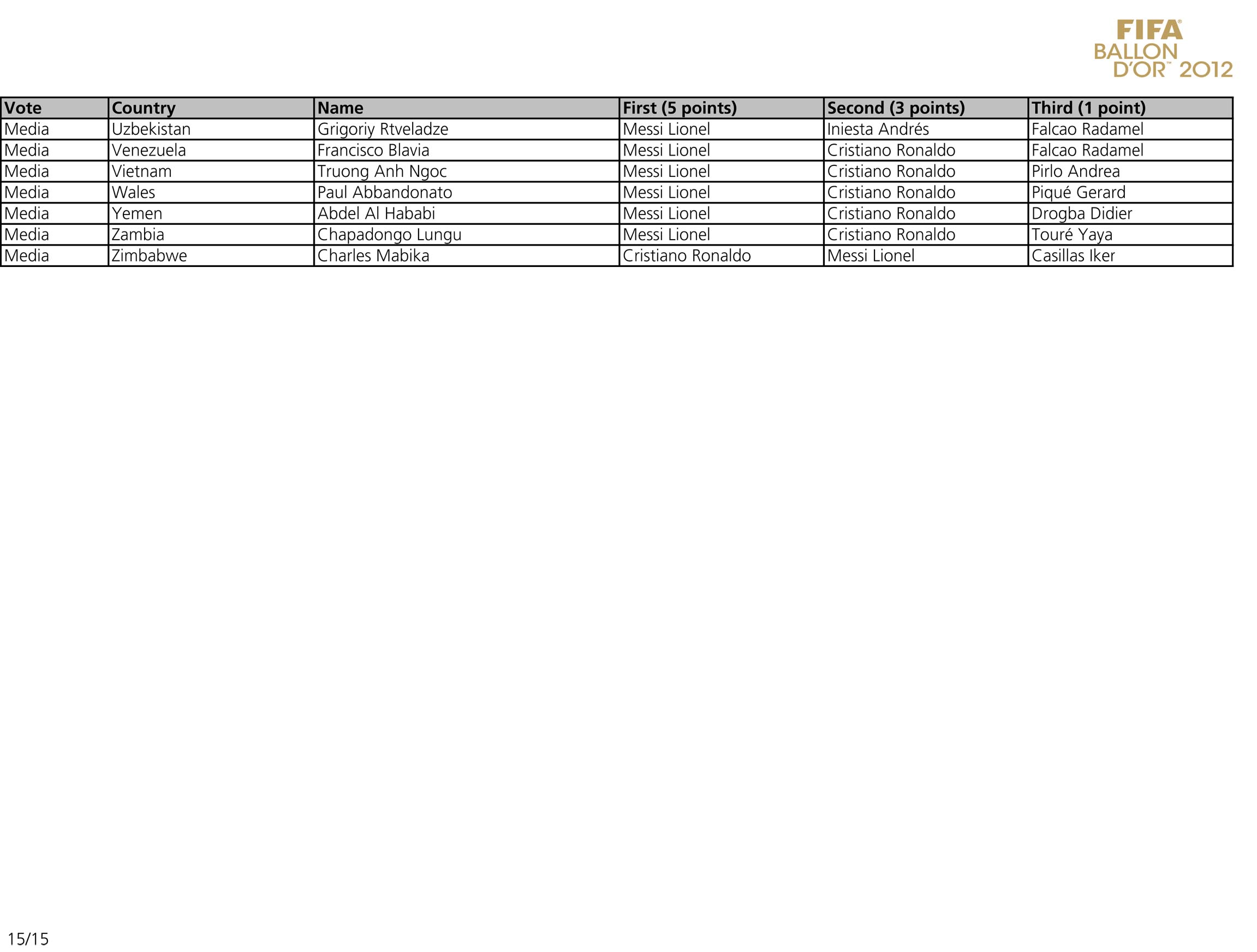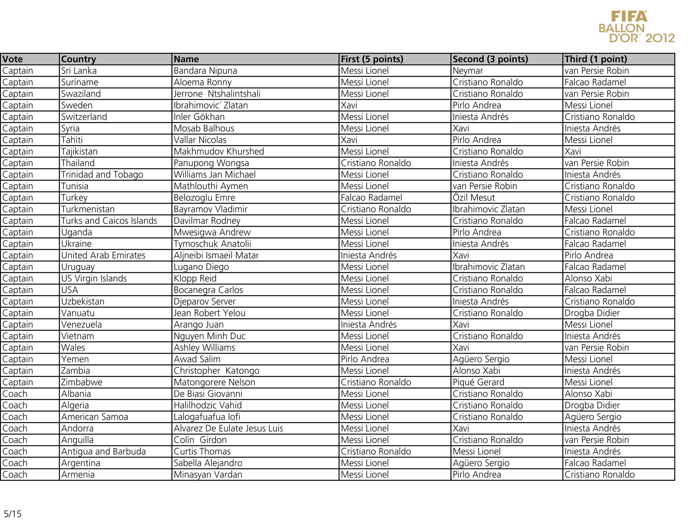 Результаты голосования за титул обладателя "Золотого Мяча - 2012" (ФОТО)