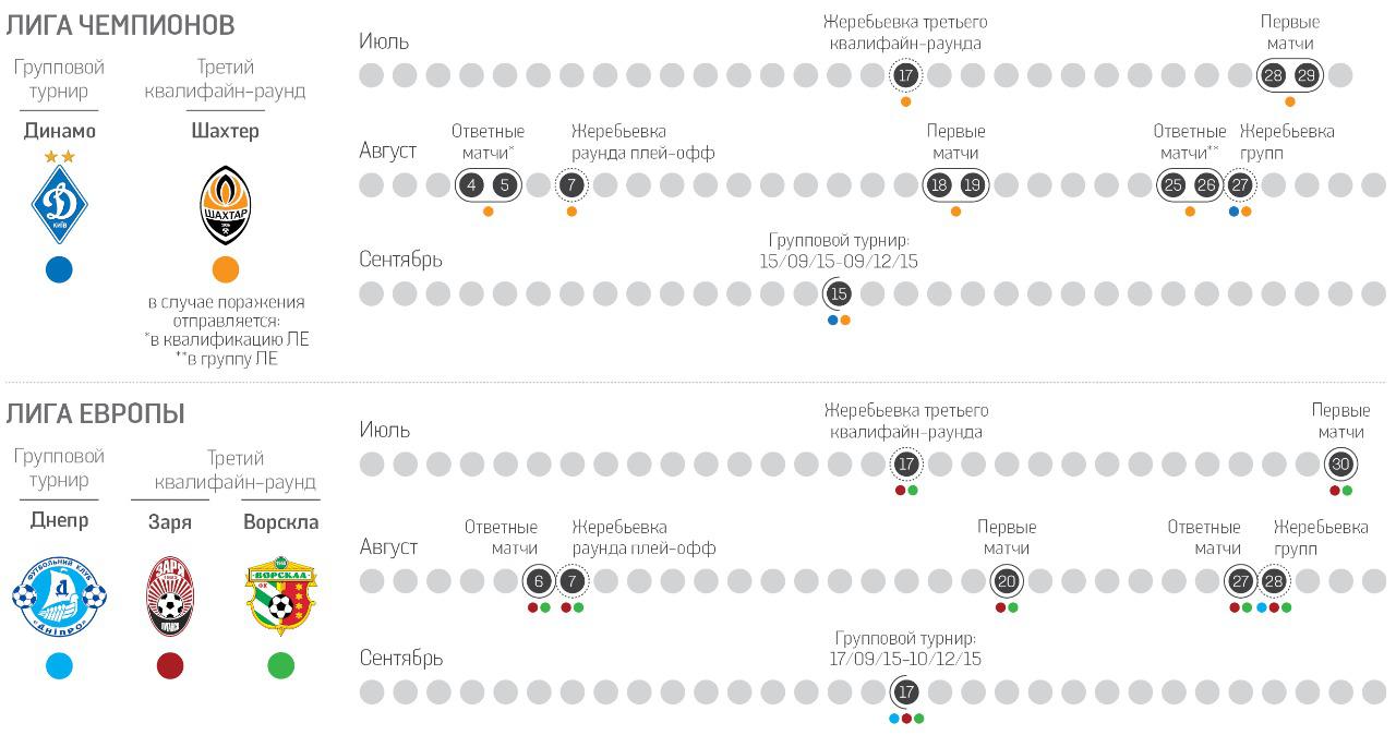 "Динамо" уже имеет пропуск в групповой турнир ЛЧ, а "Днепр" - в группу ЛЕ. Проходить отбор выпало "Шахтеру", "Заре" и "Ворскле".