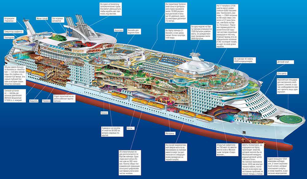 На 17 палубах в 2706 каютах могут разместиться 6360 пассажиров.