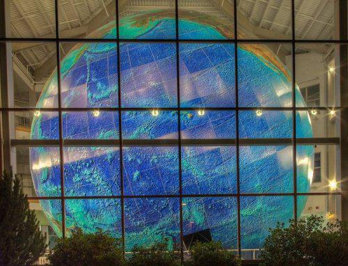 Уникальный вращающийся глобус Земли весит более 2.500 кг. Его масштаб составляет 1:1000000 (т.е. 1 мм на макете соответствует 1 км на поверхности Земли). Размеры глобуса настолько велики, что рассмотреть Северное полушарие можно только со второго и третьего этажей.