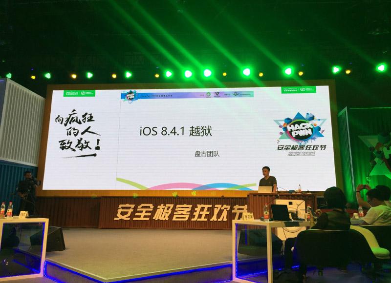 В официальном блоге Pangu Team на сайте Weibo опубликованы фотографии с выступления одного из участников команды. На большом экране позади хакера можно видеть надпись «Джейлбрейк iOS 8.4.1» на китайском языке. «Команда экспертов по безопасности Pangu Team взломала систему защиты iOS 8.4.1», – произнес со сцены участник хакерской группировки.