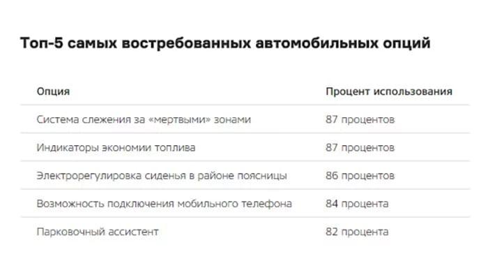 Среди востребованных функций отмечаются различные электронные помощники, системы безопасности и индикаторы топливной экономии.
