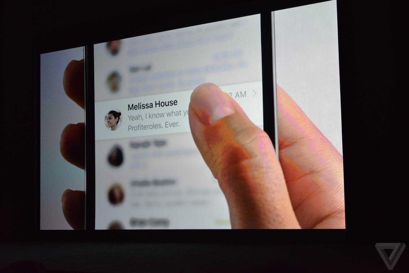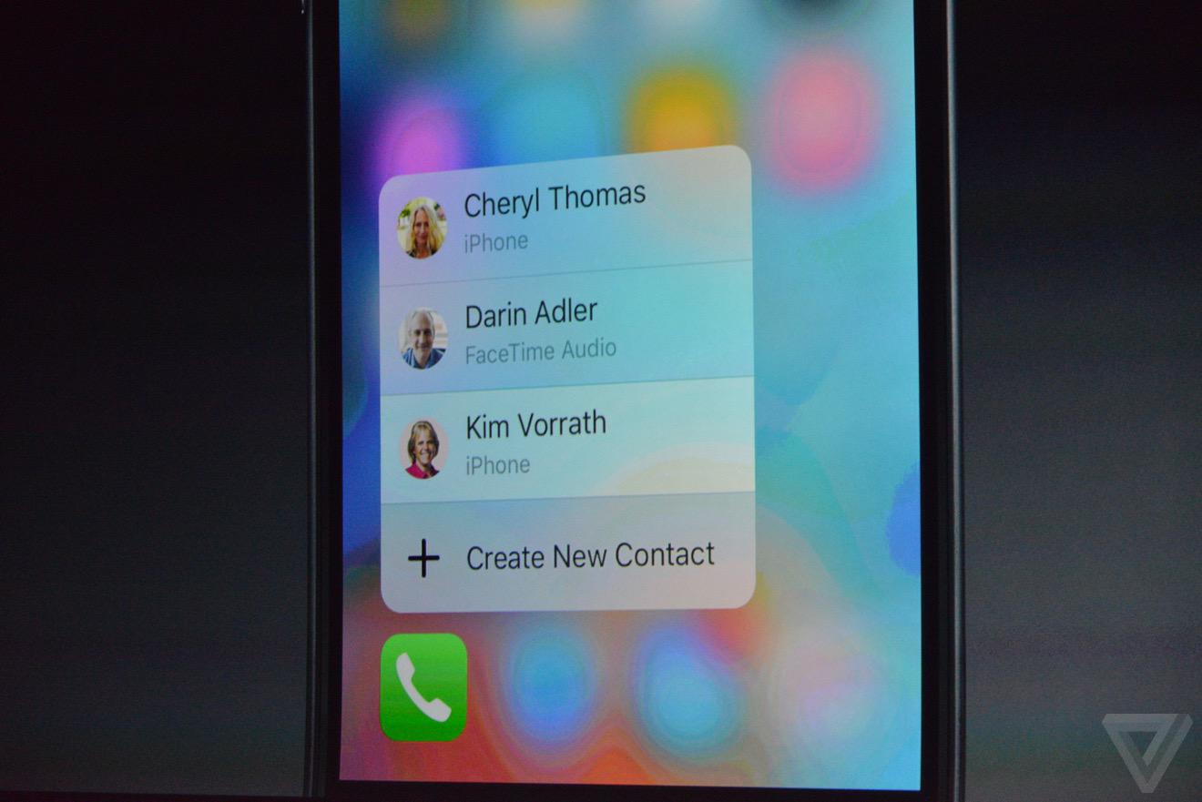 Ключевой особенностью следующего поколения iPhone стал сенсорный дисплей с поддержкой технологии распознавания силы нажатия 3D Touch. Напомним, схожая технология Force Touch, впервые представленная в «умных» часах Apple Watch, а затем нашла применение в ноутбуках MacBook. iPhone 6s смогут отличать несколько видов прикосновения, что должно сделать работу с мобильными приложениями более удобной, а доступ к их функциям — более быстрым. Так, сильное нажатие на точку на карте без дополнительных манипуляций вызовет функцию навигатора, который доведет пользователя до места назначения. Нажатие на иконки на домашнем экране позволит быстрее использовать функции приложений. В приложении Apple Music нажатие на экран с усилием будет вызывать список наиболее часто используемых действий, как, например, добавление песни в плейлист или сохранение трека для прослушивания в офлайн-режиме.