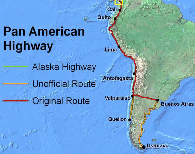 Дорога берет начало на Аляске в Северной Америке и заканчивается на юге Южной Америки. Шоссе пересекает большое количество разных регионов, как климатических, так и экологических: начиная от непроходимых джунглей и заканчивая ледяными горными перевалами. Определенные участки трассы возможно пройти лишь в сухую погоду.